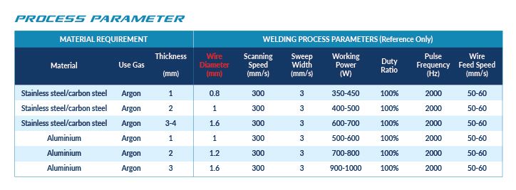 Power 2000W Laser wavelength 1070nm-1090nm Frequency 50-60Hz Voltage 220V Beam quality 1:1 Process Parameter