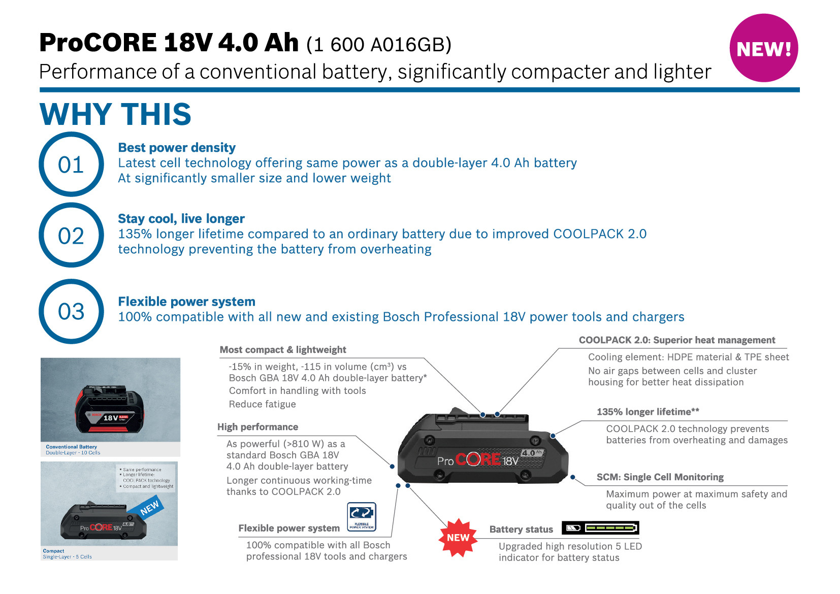 - 18 V 4,0 Ah batteries have the same weight as existing Bosch 3.0 Ah batteries and are the lightest in the market