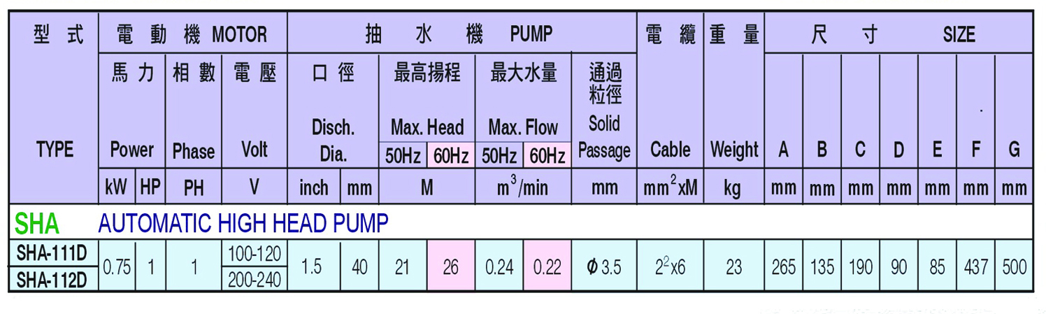 Brand: Showfou Features: Power: 1 HPFrequency: 50HZ/60HZMotor: 2 polesMotor Casing: Stainless 304Impeller: BronzeSHOWFOU Automatic High-head PumpModelSHA Product SpecificationsClick to view